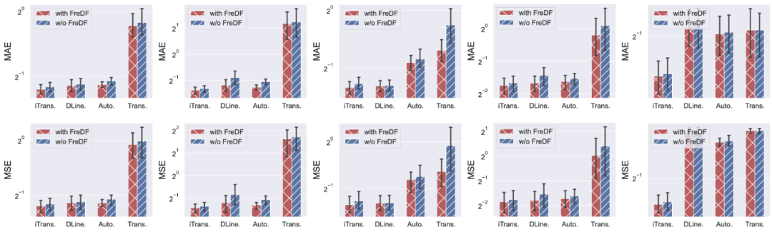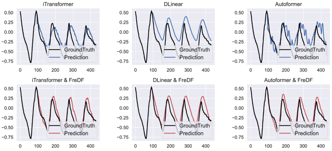 论文还测试了 FreDF 在不同神经网络架构上的表现,包括 iTransformer、DLinear、Autoformer 和 Transformer 等,证明了其与模型无关的特性:可以切实有效提升大多数主流时序预测模型的精度。