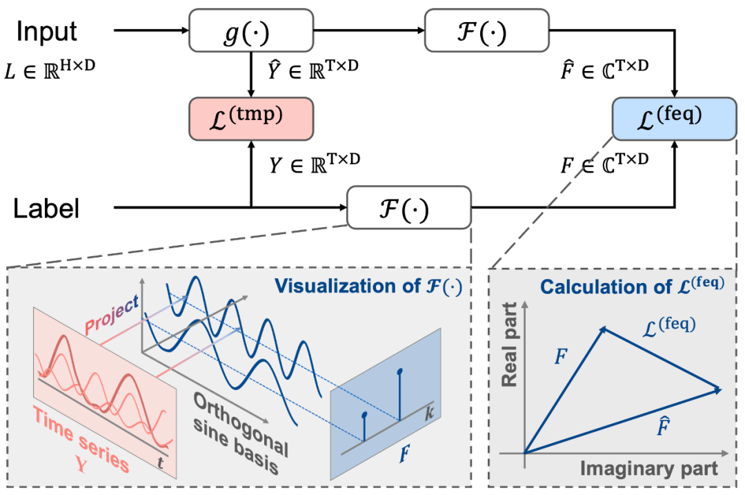 # 原时域损失loss_tmp = ((outputs-batch_y)**2).mean()# 所提频域损失loss_feq = (torch.fft.rfft(outputs, dim=1) - torch.fft.rfft(batch_y, dim=1)).abs().mean()# 注释1. 频域损失可与时域损失加权融合,也可单独使用,一般均有性能提升,见灵敏度实验部分。# 注释2. 频域损失使用MAE而不是MSE,是因为不同频谱分量的量级相差非常大。使用MSE会进一步放大这种差异,导致优化过程不稳定。