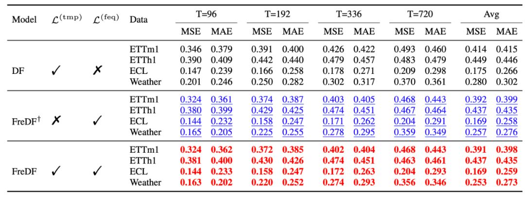 论文还进行了消融实验,研究时域损失、频域损失对模型性能的贡献。结果表明:仅使用频域损失即可取得显著的性能改进,而适当融合时域损失可以进一步优化性能。