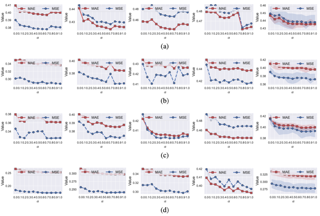 进一步细化消融实验,研究权重 α 对性能的影响。在绝大多数情况下,频域损失的性能均优于时域损失(α=1 vs α=0)。这说明即使不对 α 做调节,直接将时域损失替换为频域损失,也可以有效提升时序预测性能,真正实现「一行代码涨点」。此外,预测性能一般在 α 接近 1(如 0.8 或 0.9)时最佳。这意味着在时域和频域损失之间取得适当的平衡,并适当强调频域损失,可以获得较好的预测结果。