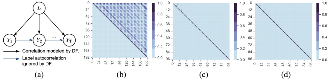 为预测值。该方法隐式假设标签序列在给定输入时条件独立(这样极大似然才等价于最小化 MSE)。但时间序列预测任务中,标签序列往往呈现显著的自相关性。因此,现有 DF 方法与时序数据生成机制存在失配。