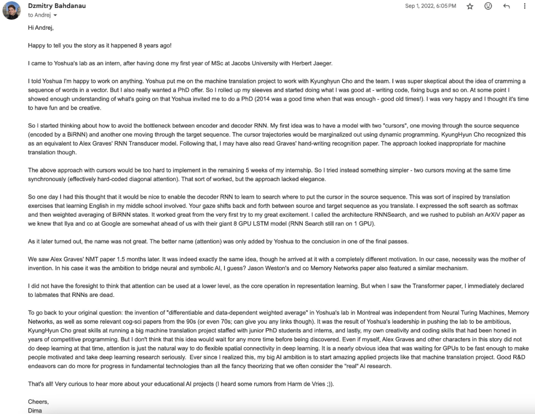 在发给 Karpathy 的邮件中,Dzmitry Bahdanau 曾详细谈过他们当年研究「注意力机制」的往事。
