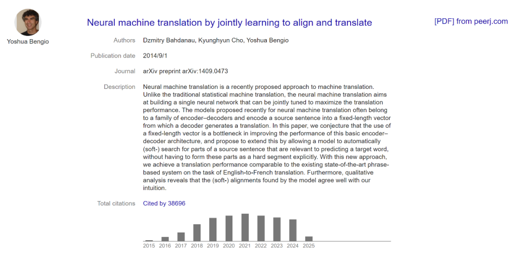 具体来说,这篇论文的创新之处在于,它引入了一种注意力形式,从根本上改变了序列到序列模型处理信息的方式。在此之前,编码器 - 解码器架构通常将整个输入序列压缩为固定长度的向量,从而为较长的序列造成内存瓶颈。该方法使模型能够在翻译过程中动态地「关注」源句子的不同部分,从而处理相关的上下文信息。这种注意力机制已经成为现代深度学习的基石,远远超出了机器翻译的范畴,形成了 transformer 和大型语言模型的基础。这篇论文的实际影响是巨大的,使其成为对神经网络架构最有影响力的贡献之一。