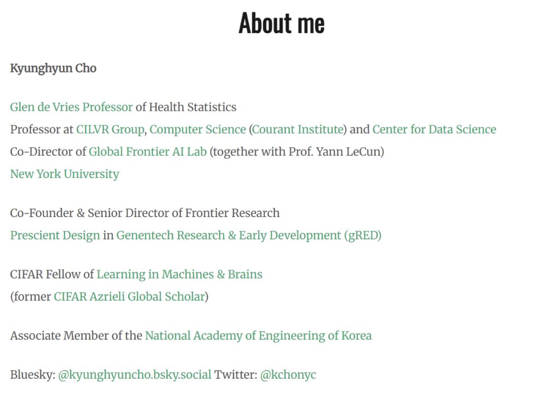 另一位作者 Kyunghyun Cho 是纽约大学计算机科学和数据科学教授,同时担任 Genentech Research & Early Development (gRED) Prescient Design 团队的前沿研究执行总监。2025 年,他被任命为 Glen de Vries 健康统计学教授。在获奖论文写作期间,他曾在蒙特利尔大学担任博士后研究员,师从 Yoshua Bengio 教授。