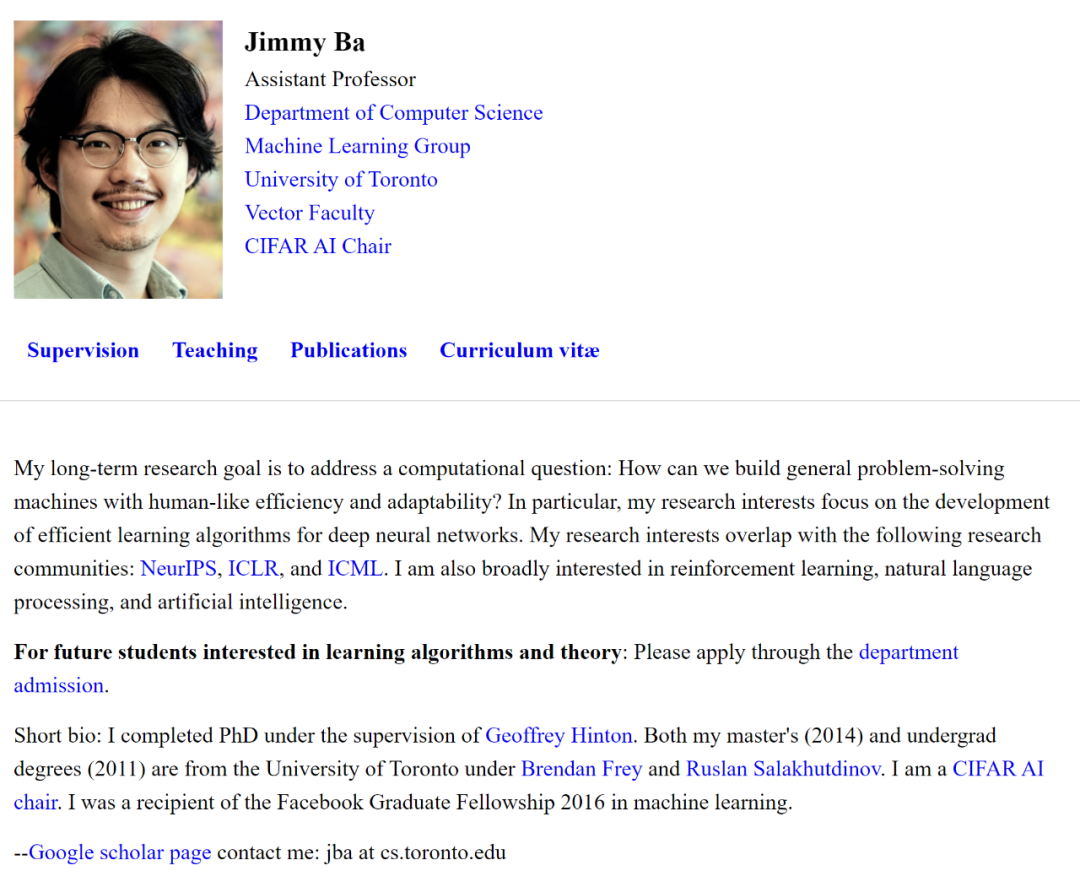 Jimmy Lei Ba 在 Geoffrey Hinton 的指导下完成了博士学位。他的硕士(2014 年)和本科学位(2011 年)均在多伦多大学获得,师从 Brendan Frey 和 Ruslan Salakhutdinov。他是 CIFAR AI chair,曾在 2016 年获得 Facebook 机器学习研究生奖学金。