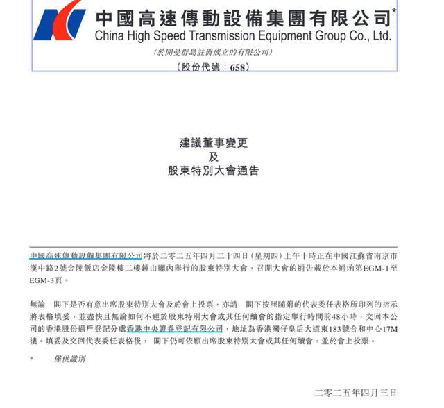 对于丰盛控股召开股东大会的要求,中国高速传动也及时响应。4月3日,中国高速传动公告,将在4月24日召开股东大会审议罢免董事长胡吉春及选举新董事的事项。