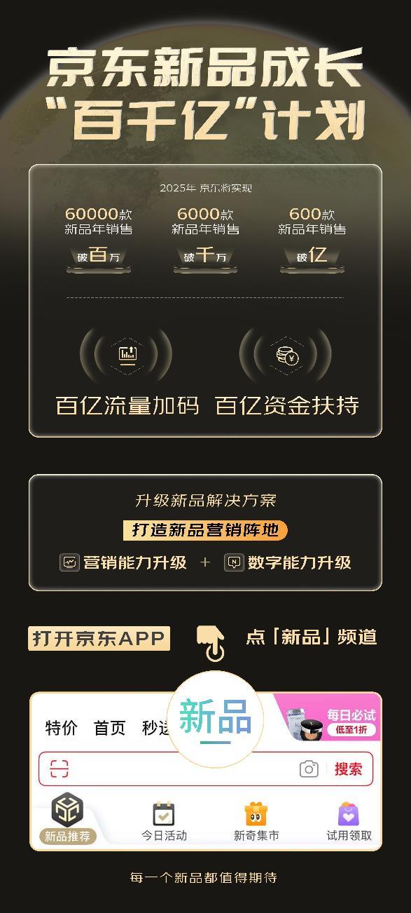 4月15日,2025京东新品年度盛典在北京举行,正式推出京东新品成长“百千亿”计划,即在2025年加码百亿流量和百亿资金,并围绕营销能力与数字能力全面升级,实现60000款新品年销售破百万、6000款新品年销售破千万、600款新品年销售破亿。