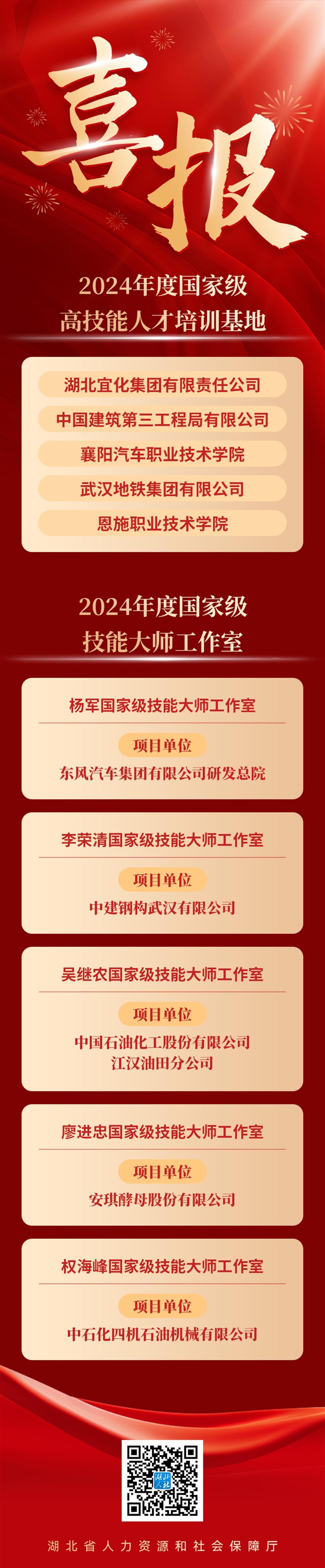 4月15日,极目新闻记者从湖北省人社厅了解到,近期,人力资源社会保障部办公厅、财政部办公厅公布2024年国家级高技能人才培训基地和技能大师工作室项目单位备案名单,湖北省5家国家级高技能人才培训基地、5家国家级技能大师工作室入选。