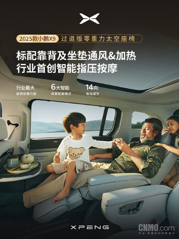 除了以上这些亮点之外,2025款小鹏X9还在细节之处做了很多优化。例如,后轮转向功能可提升了车辆的灵活性和操控性;新增的20英寸多辐式运动轮毂满足了消费者对个性化的需求;全车包覆面积升级至26.6㎡的无铬鞣高级真皮和环保皮质,让车内更加豪华舒适。