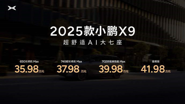 4月15日晚,2025款小鹏X9正式上市,新车共推出了3种版本,售价35.98万元-41.98万元。