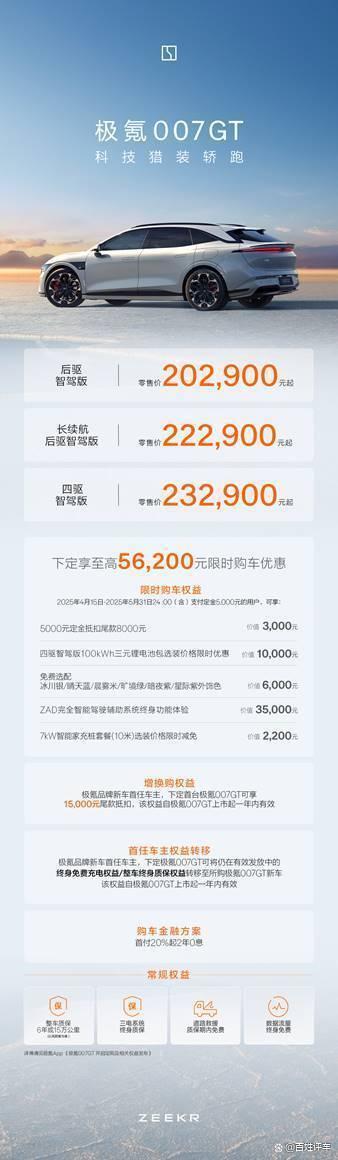 2025年4月15日到2025年5月31日(含),所有支付定金5000元的用户,可享至高5.62万元限时购车权益,包括:下定极氪007GT全系车型,可享5000元定金抵8000元尾款,免费选配价值6000元外饰色(冰川银/晴天蓝/晨雾米/旷境绿/暗夜紫/星际紫),价值35000元ZAD完全智能驾驶辅助系统终身免费功能体验,7kW智能家充桩套餐(10米)选装价格限时减免2200元。下定极氪007GT四驱智驾版,还可享100kWh三元锂电池包选装价格限时优惠10000元。