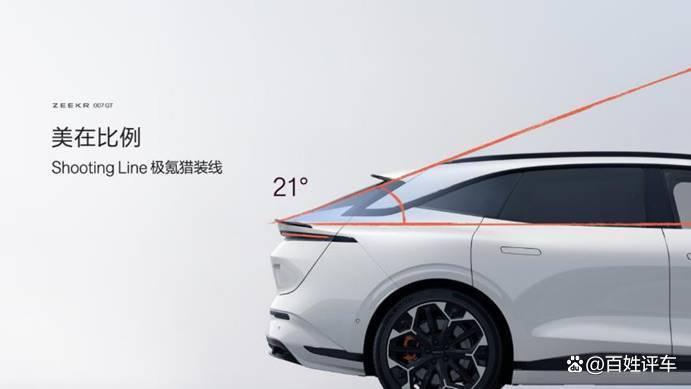 极氪007GT,美在比例。原创Shooting Line极氪猎装线,线条夹角锁定为21°,兼具姿态美、风阻低、空间大,是功能与美学结合的黄金线。夹角过大,整车设计将变得更加中庸方正,更接近传统旅行车。夹角过小,设计将更接近溜背车,第二排和后备厢空间都受到影响。