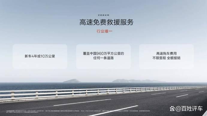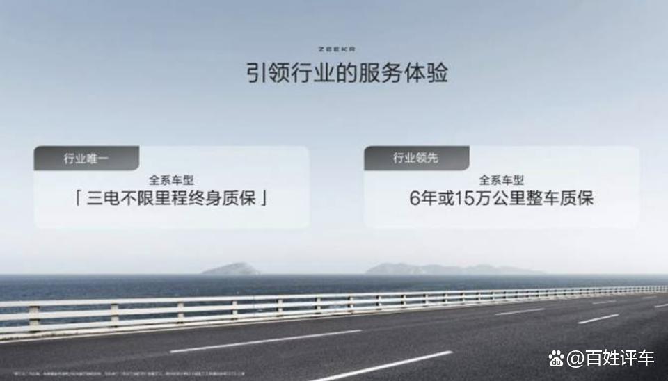 豪华服务,要有引领行业的服务体验。极氪提供全系车型“三电不限里程终身质保”,行业唯一,并在全行业率先取消关于长期停放的全部免责条款。极氪提供高速免费救援服务,行业唯一。新车4年或10万公里内免费道路救援,覆盖全国任何道路,高速拖车费用不限里程全额报销,行业唯一。 还有“1小时快保,24小时快喷”、远程预警诊断及主动提醒、车辆代客值守、免费取送车、免费维保接送等服务,新老用户同享。