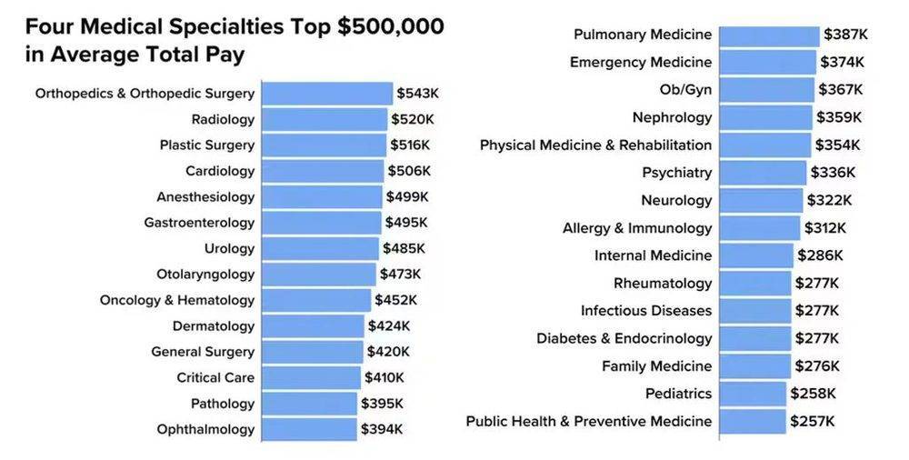 此次调研中,一共有11个专科的平均年薪在40万美元以上,而7个“垫底”科室医生的收入则在25万美元至30万美元之间,仅有骨科医生的约一半。