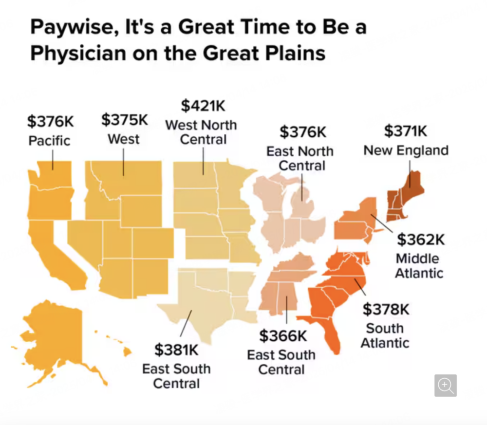 2024年,美国不同地区医生的平均年收入