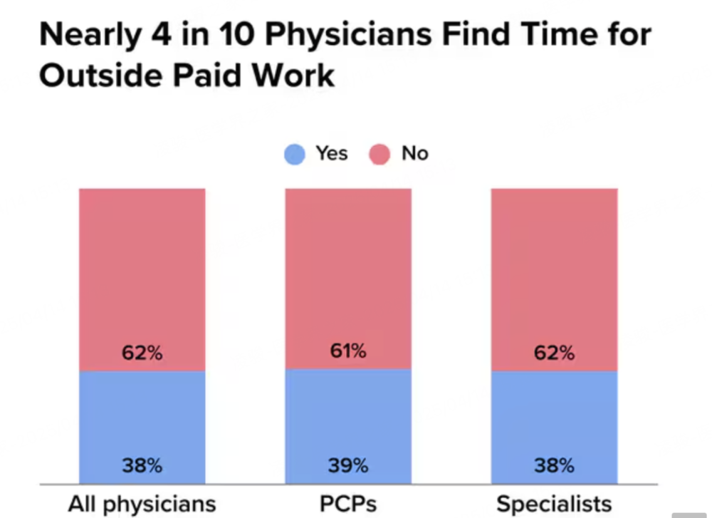 此次《报告》也指出,医生群体还更具有“职业灵活性”,容易找到高薪兼职,包括远程医疗轮班、急诊室兼职、多点执业等。体现在此次调研中,有40%的美国医生在这方面获得了额外的收入。