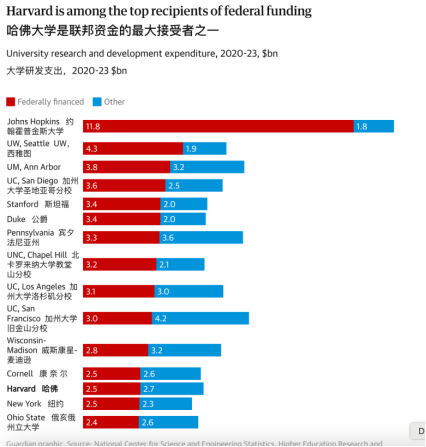 那么,本次特朗普用作威胁的90亿经费对哈佛有多重要?据《哈佛公报》披露,政府在审的90亿美元拨款包括对哈佛大学及其几家知名附属医院(包括麻省总医院、丹娜—法伯癌症研究所和波士顿儿童医院)未来的承诺拨款约87亿美元,以及对哈佛大学的2.56亿美元科研支持。根据卫报的统计数据,单就对大学科研的资助而言,来自联邦政府的资助约占哈佛大学总科研经费的一半(见下图)。
