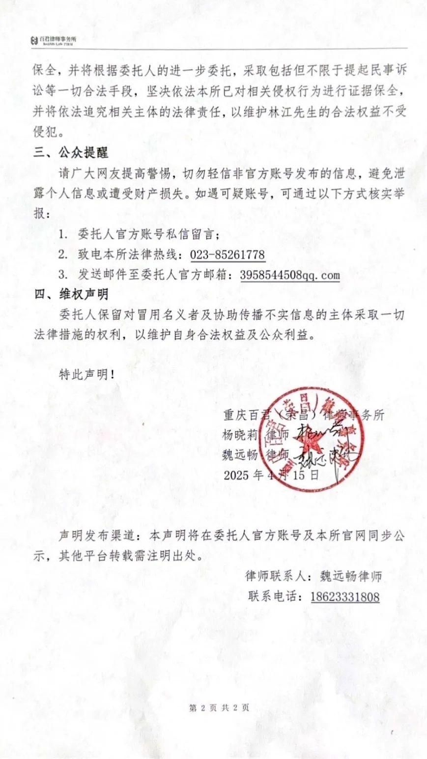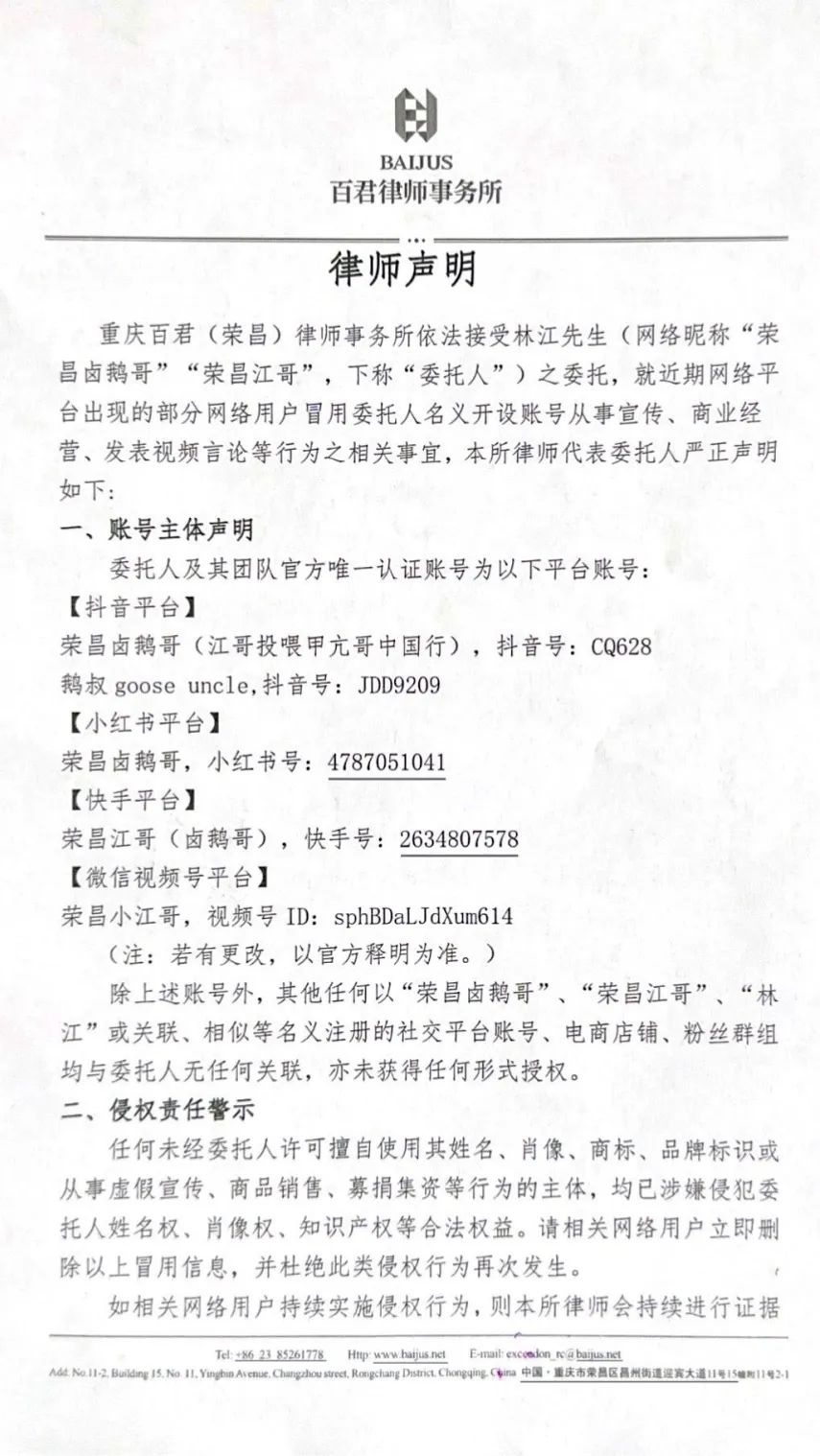 4月16日,“荣昌卤鹅哥”林江委托律师事务所就近期网络平台出现的部分网络用户冒用其名义开设账号从事宣传、商业经营、发表视频言论等行为发布律师声明。