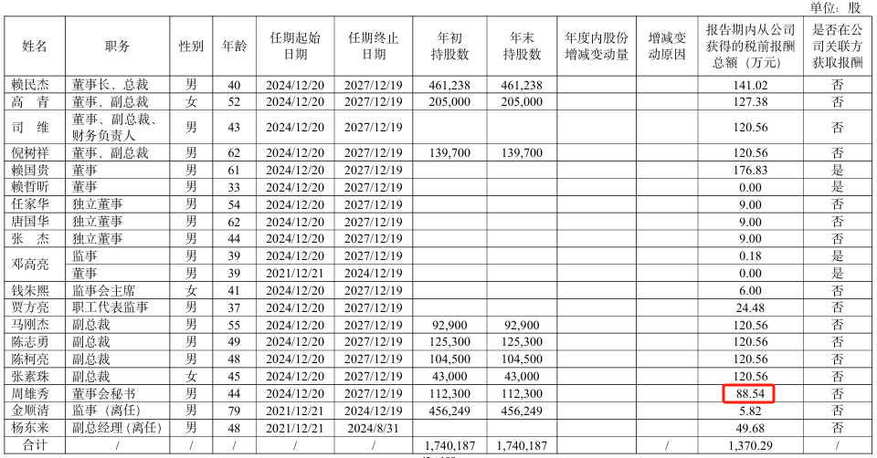 董事会秘书周雄秀2024年薪酬为88.54万元,2023年薪酬为67.77万元,涨薪20.77万元。2022年薪酬为64.54万元。