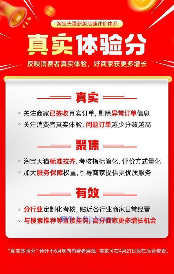 4月16日,淘宝天猫公告“关于新增《淘宝平台店铺真实体验分规范》的意见征集”,宣布即将上线新版店铺评价体系“真实体验分”。 公告称,淘宝天猫将重新制定能够真实反馈消费者体验的店铺评价体系,以解决行业虚假评分顽疾、提升消费者购买决策信心、激励商家提升服务质量。