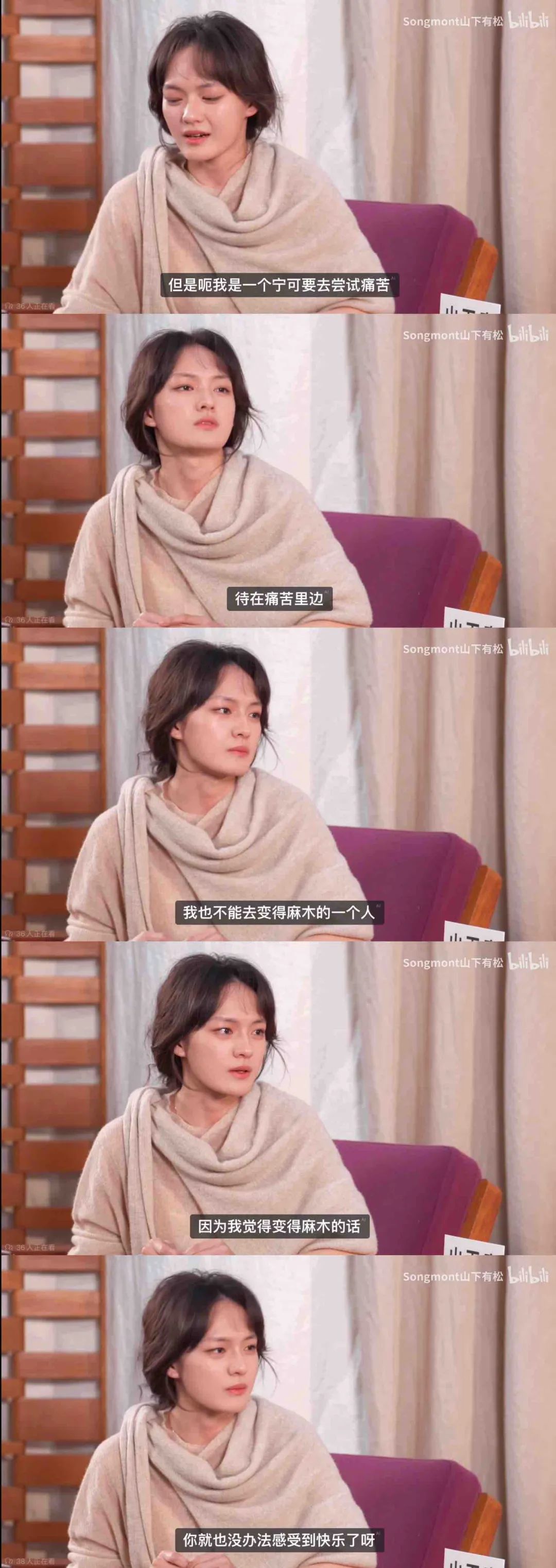 而对于成长一路以来感受到的痛苦,她则表示:“我是一个宁可去尝试痛苦,或者说待在痛苦里面,我也不能去变得麻木的一个人。因为我觉得感到麻木,也就无法感受到快乐了。”