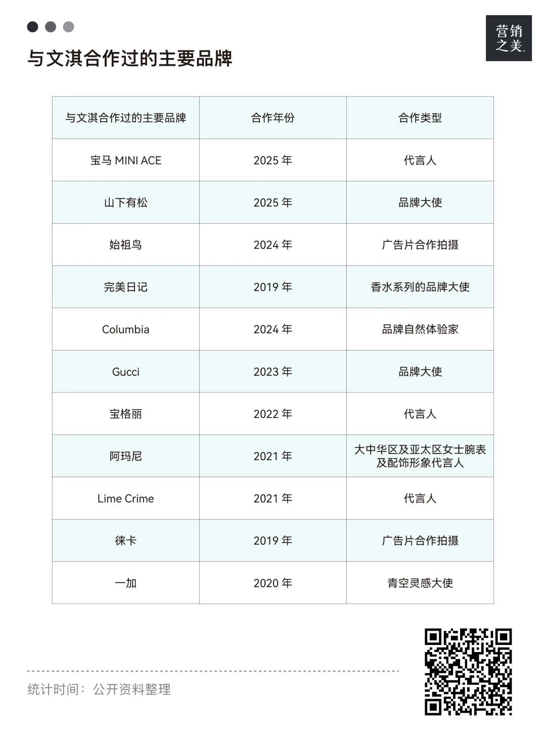 除了品牌代言人外,文淇和品牌合作的形式多样,包括品牌大使、品牌自然体验家、灵感大使和单次的广告拍摄合作。