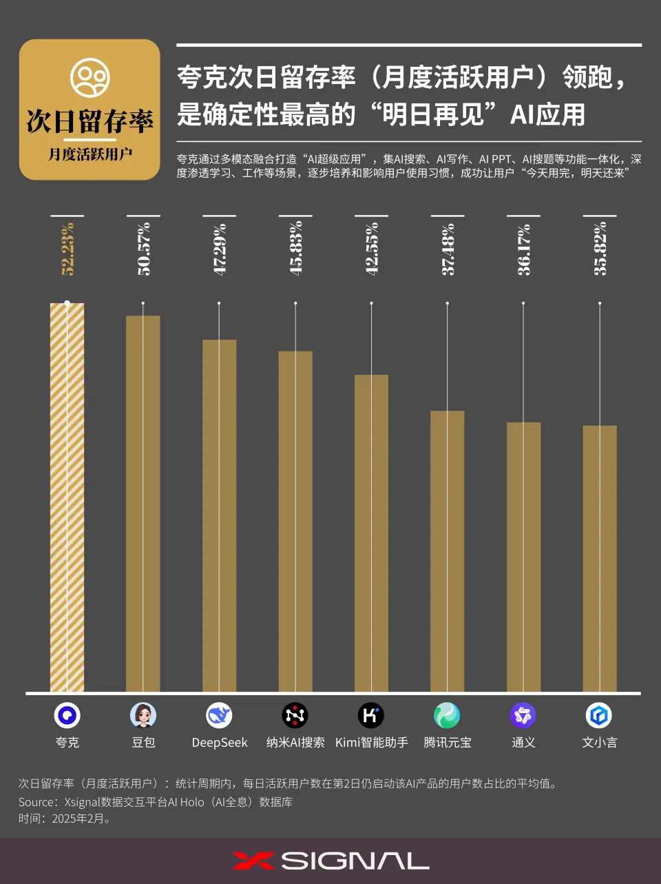 另据 Xsignal 发布数据,夸克在多个关键指标中领跑:月活跃用户数同比增长 53%,次日留存率高达52%,用户活跃率以27%排名第一,人均单日使用时长为 33 分钟,大幅领先第二名。