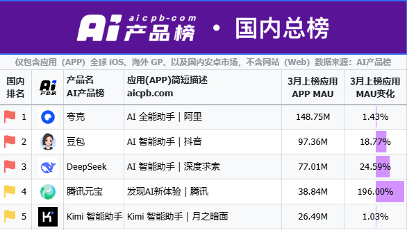 4月16日,AI产品榜(Aicpb.com)网站数据显示,夸克在3月份以1.48亿月活用户登顶国内总榜第一,超越豆包、DeepSeek和腾讯元宝。