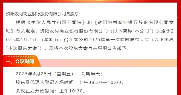 四川农信系统改革不断推进,资阳市传来新消息。近日,四川资阳农村商业银行股份有限公司(下称“资阳农商银行”)在其官方微信公众号发布公告,将于4月25日召开2025年第一次临时股东大会,审议一系列重要议案。其中,包括《资阳农村商业银行股份有限公司吸收合并四川安岳农村商业银行股份有限公司、四川乐至农村商业银行股份有限公司的议案》《关于成立资阳市市级统一法人农村商业银行改革工作组的议案》等。这意味着四川将再添一家市级统一法人农商行,安岳农商行和乐至农商行两家县域农商行将融入新的体系。