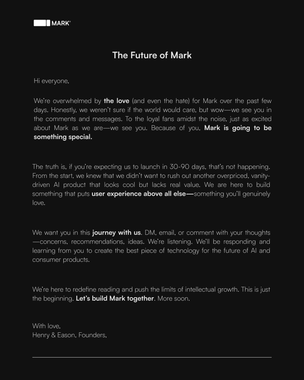 Mark官方发布创始人的一则声明,其中提到“事实是,如果你期待我们在30到90天内发布,那是不可能的。”