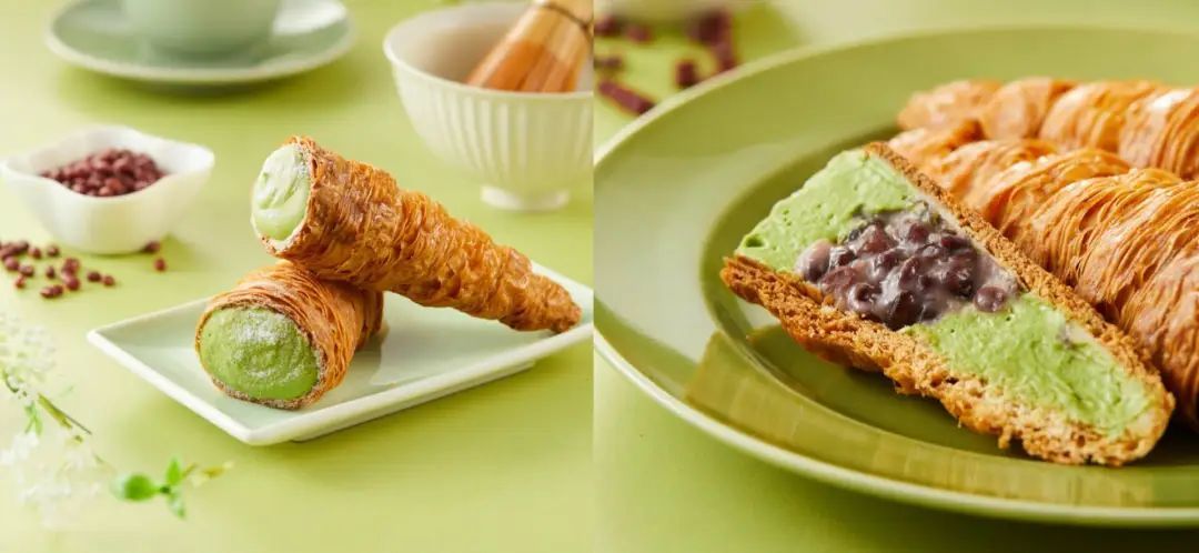 比如,盒马最近就推出了一款名为“千目抹茶可颂号角”的新品,只看名字会觉得“号角”有些抽象,不过这款新品本身外观确实如同号角一般,名为“号角”也就不难理解了。