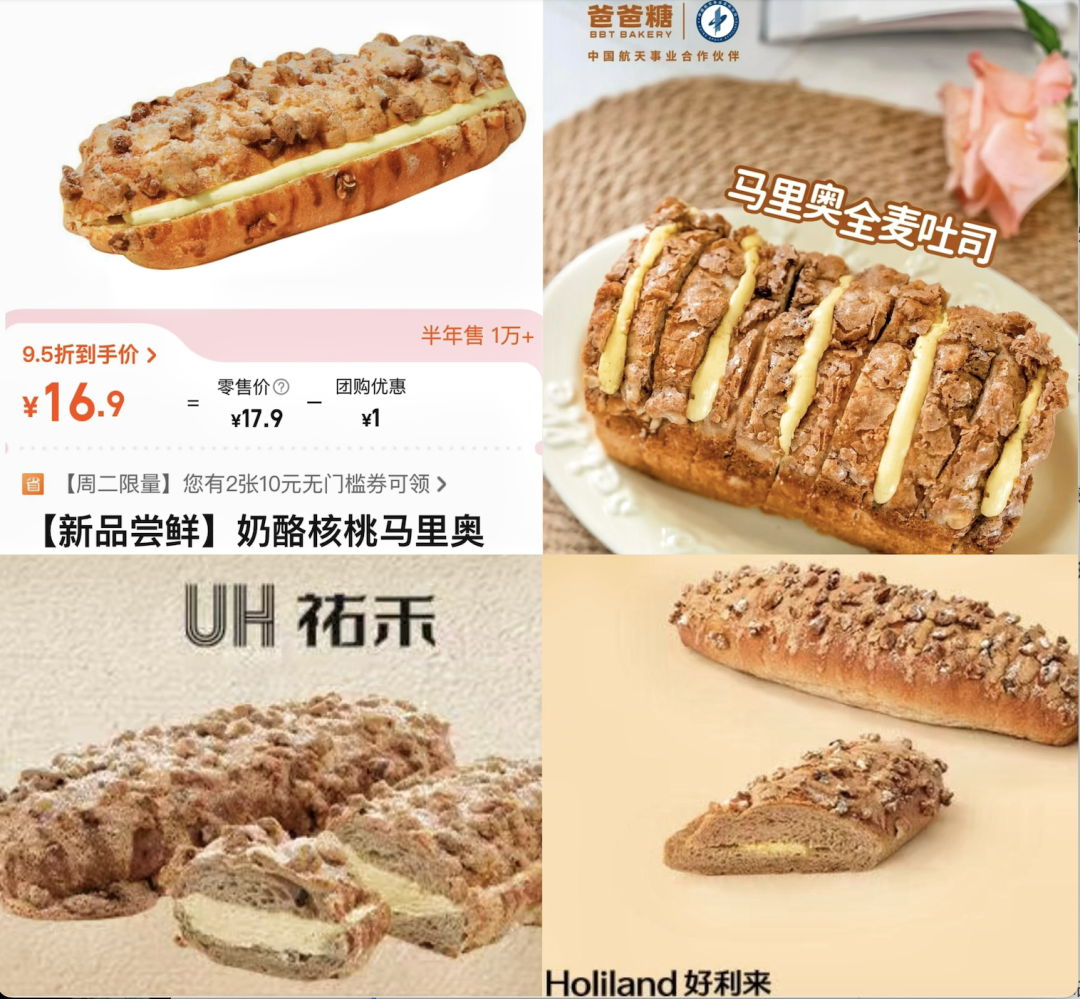“马里奥”面包是许多品牌都推出过的经典面包品类,好利来家有“脆香核桃马里奥”,UH祐禾家叫“超级核桃马里奥”,味多美则叫“奶酪核桃马里奥面包”,爸爸糖吐司面包也曾推出“马里奥全麦吐司”。