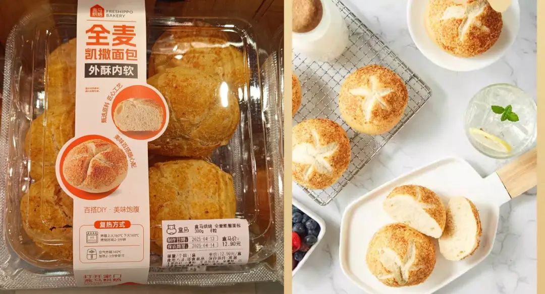 在盒马逛一圈,会发现像这样怪怪的面包名字不在少数,比如“黄油布里欧汉堡胚”“全麦凯撒面包”等。