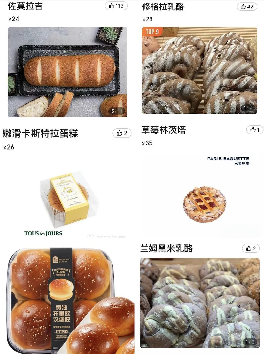 部分面包商品图|图源:多乐之日、巴黎贝甜、UH祐禾、原麦山丘美团店铺商品页面截图、盒马APP截图
