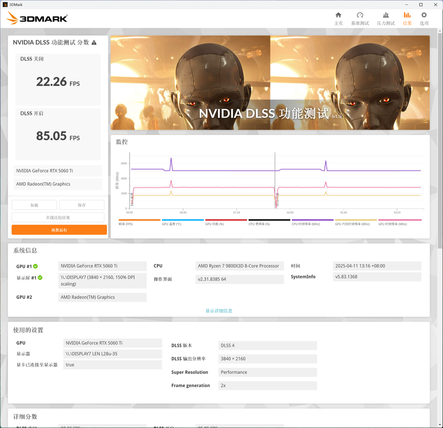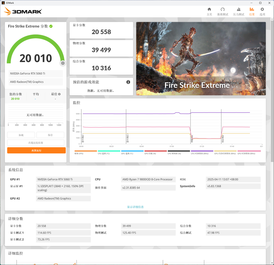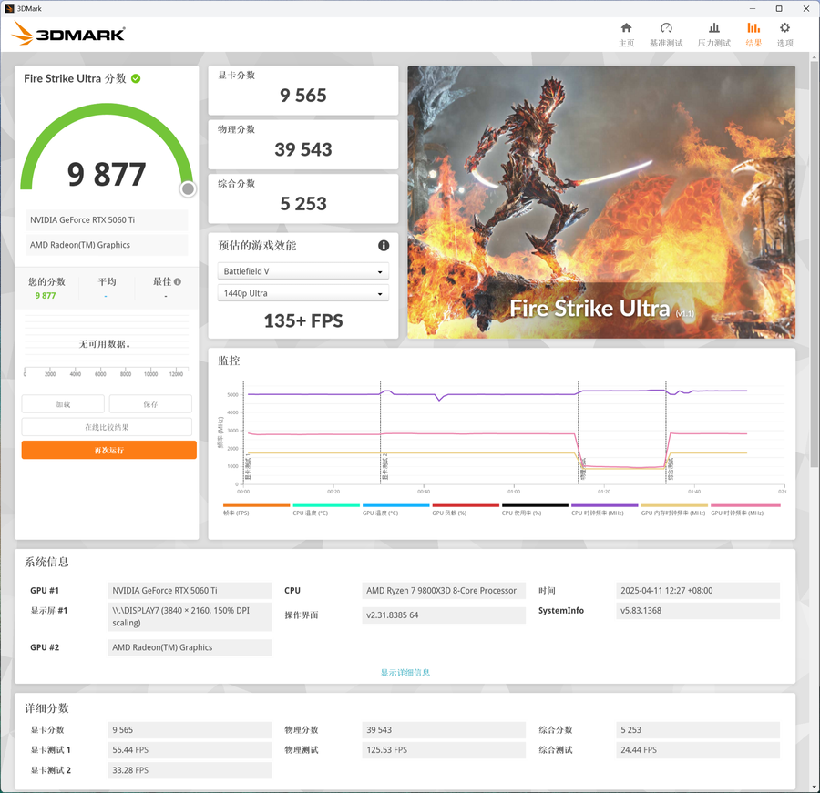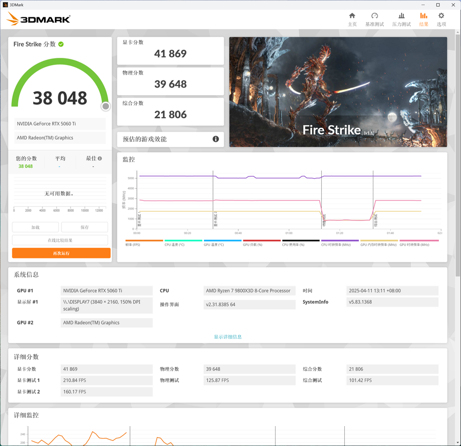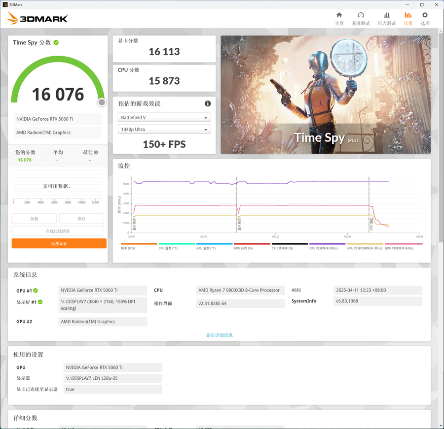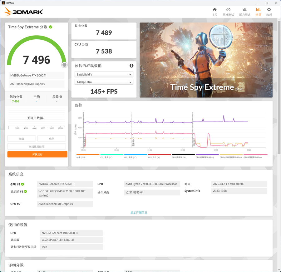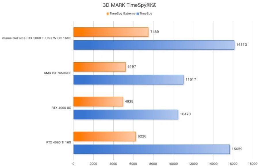 3D MARK的TimeSpy测试能够反映显卡在2K分辨率下的游戏性能,iGame RTX 5060 Ti Ultra三风扇显卡在TS和TSE的测试中分别取得了16113和7489的显卡分数,在2K分辨率下能够带来150+FPS以上的游戏帧数。