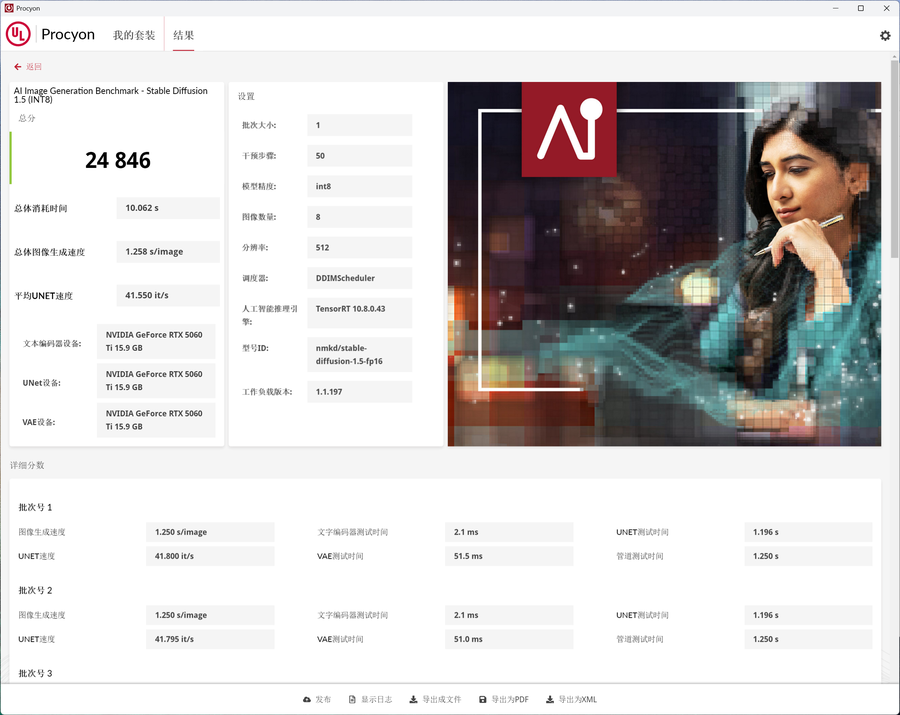 在INT8精度下,iGame RTX 5060 Ti Ultra三风扇显卡综合得分为24846,平均每1.258秒生成一张图,依旧很优秀。