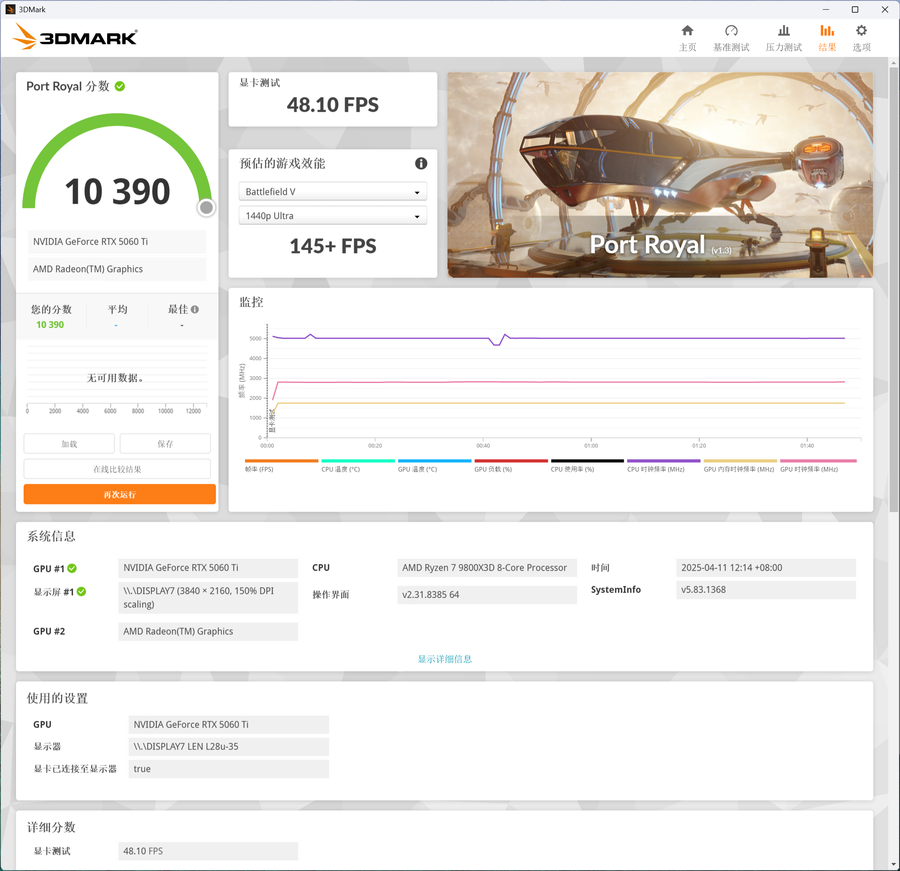 在3D MARK的Port Royal光追性能测试中,iGame RTX 5060 Ti Ultra三风扇显卡的成绩为10390,在2K分辨率下玩游戏能够实现145+FPS的游戏帧数,游戏体验将非常出色。