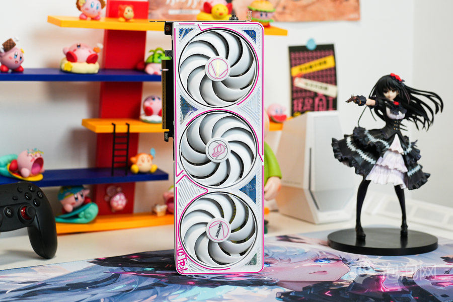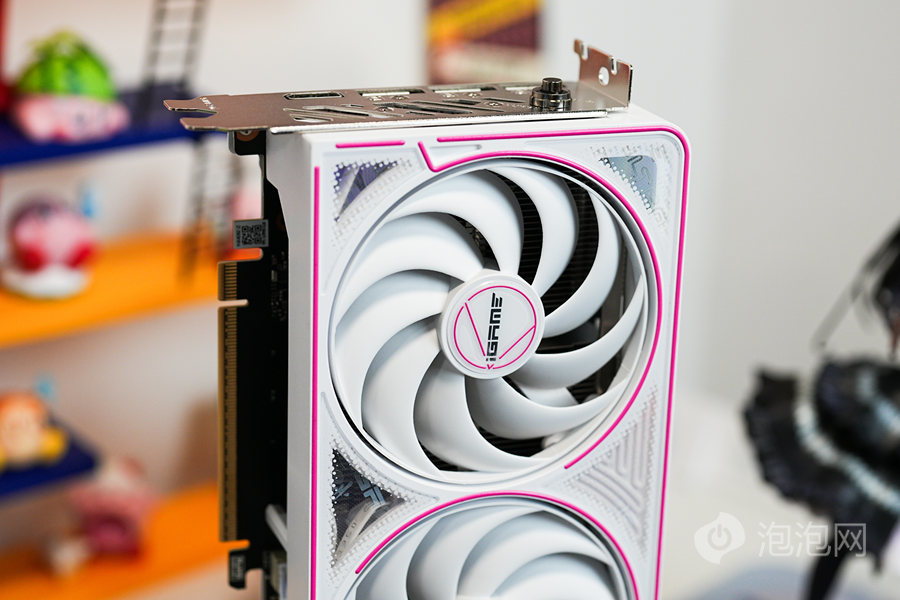七彩虹这代iGame Ultra显卡采用了全新的Hip-Hop嘻哈风设计语言,卡身以白色为基底,并以桃粉色点缀,并加入了起伏规律的弯曲线条与涂鸦字体等嘻哈元素,非常符合当下年轻用户追求潮流与个性的审美需求,显卡正面延续了上代的渐变效果,能够在不同光照角度下变化,呈现出视觉上的律动感。