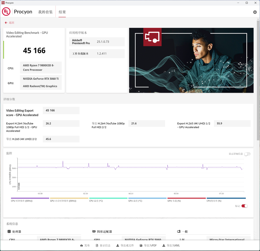 在UL Procyon针对视频编辑的Video Editing Benchmark基准测试中,iGame RTX 5060 Ti Ultra三风扇显卡视频性能测试取得了45166的分数,能够进一步提升使用PR剪辑视频时的编辑与导出速度。