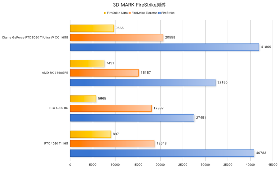 在3D MARK的FireStrike测试中,iGame RTX 5060 Ti Ultra三风扇显卡的FS\FSE\FSU分数分别是41869、20558和9565。