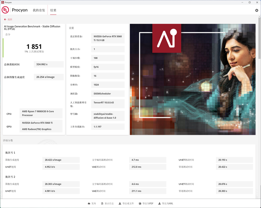 在难度较高的Stable Diffusion XL测试中,iGame RTX 5060 Ti Ultra三风扇显卡综合得分为1851,平均生成一张图为20.2秒。