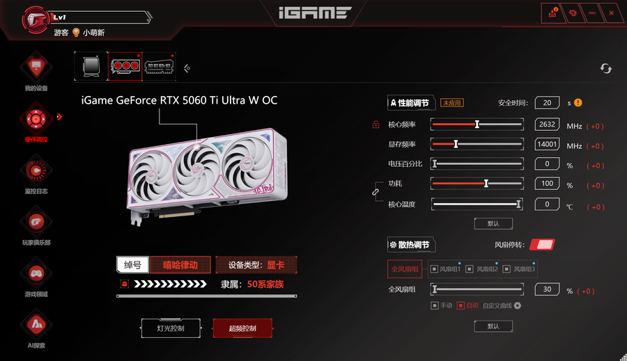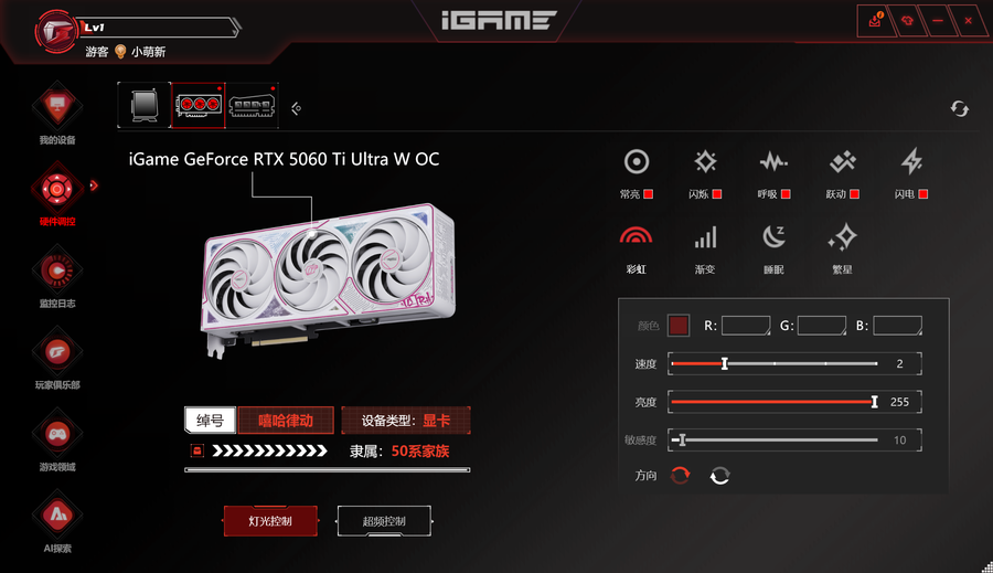 配套的控制软件升级为全新的iGame自在星球,从中可以对显卡的灯效进行调节,还可以对显卡进行超频,满足一些专业玩家更进阶的性能需求。