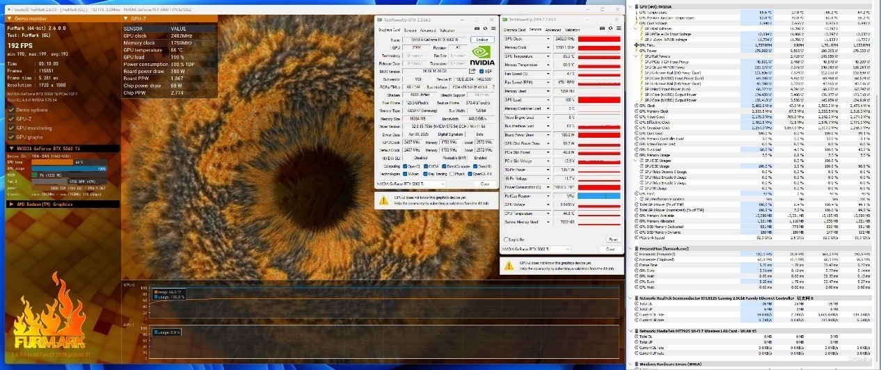 最后一项测试烤机,这也是许多玩家关注的重点。得益于微星GeForce RTX 5060 Ti INSPIRE 2X 硬派师16GB显卡出色的散热配置,整体表现非常出色。在室温20℃下,Furmark烧机10分钟后,整张显卡的温度并不高,核心仅有65.5度,显存温度更是低至60度,此时显卡的最大功率为180W,已经完全顶着TDP的上限了,风扇转速则是1761RPM,表现相当惊人。
