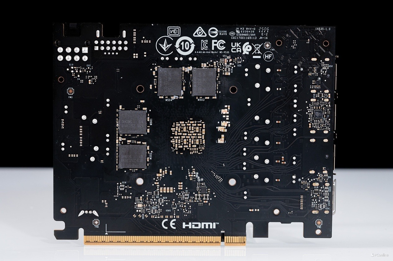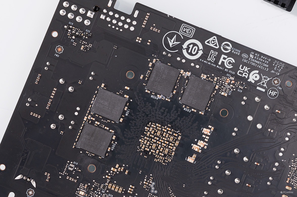 PCB的背部还有4颗GDDR7显存芯片,同样是单颗2GB,正反两面共组成了这款显卡的16GB超大显存配置。