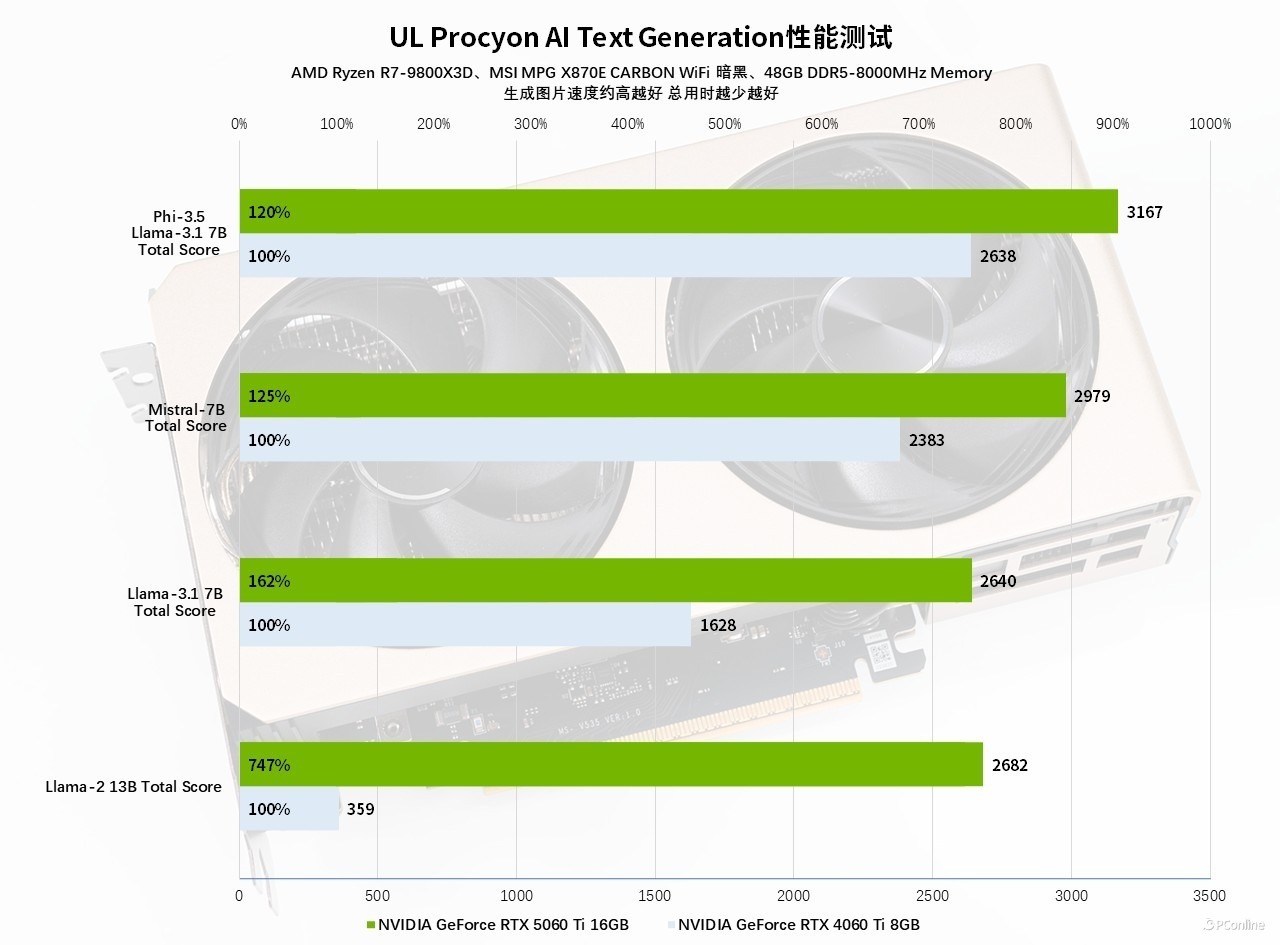 接着我们又用UL Procyon的AI Text Generation测试了更多的大语言模型,微星GeForce RTX 5060 Ti INSPIRE 2X 硬派师16GB的优势依旧十分明显,在以Llama 3.1 7B LLM打造的Phi-3.5测试中,新一代显卡取得3167分的成绩,相比RTX 4060 Ti提升了20%,将参数扩大至13B的Llama 2的测试,微星GeForce RTX 5060 Ti INSPIRE 2X 硬派师16GB也能对答如流,不过RTX 4060 Ti 8GB的显存就显得捉襟见肘了,回答速度极慢,几乎不可用,整体性能被RTX 50系甩在后面,差距有6倍以上。