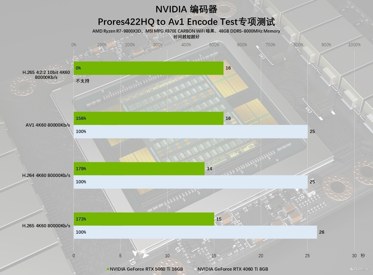 值得一提的是,GeForce RTX 50系显卡还能够支持4:2:2色度取样的视频编解码,这将节省CPU的负担,加快创作速度。上面的图表里也可以看到我们的测试成绩,实测导出时间会比上代显卡快不少,毕竟RTX 40系显卡不支持该功能,仅支持4:2:0色度采样,如果一定要4:2:2导出只能靠CPU软解。