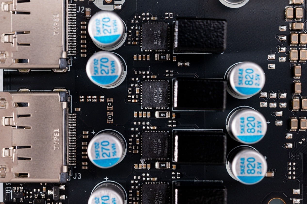 并且每一相供电都使用了低噪稳定的HCI电感以及高效率的DrMOS,其中核心DrMOS型号为uP9646A,最大支持50A电流。
