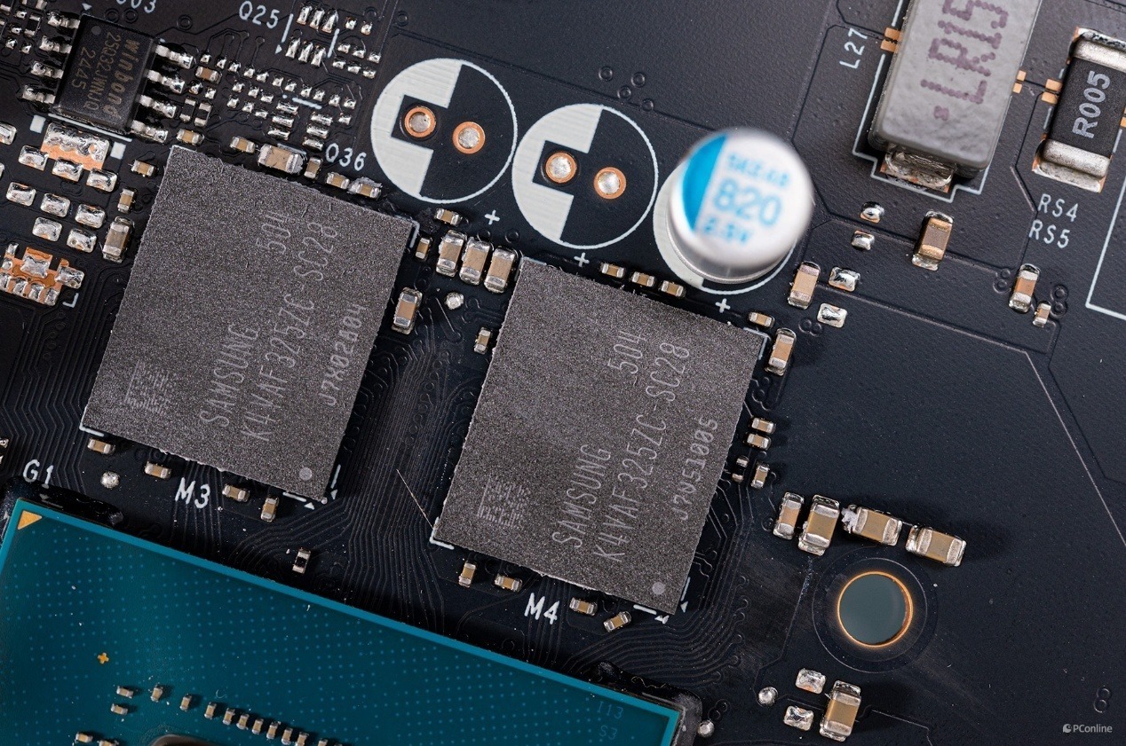 显存型号为K4VAF325ZC-SC28,内部是512M×32的架构,数据频率可达28Gbps。
