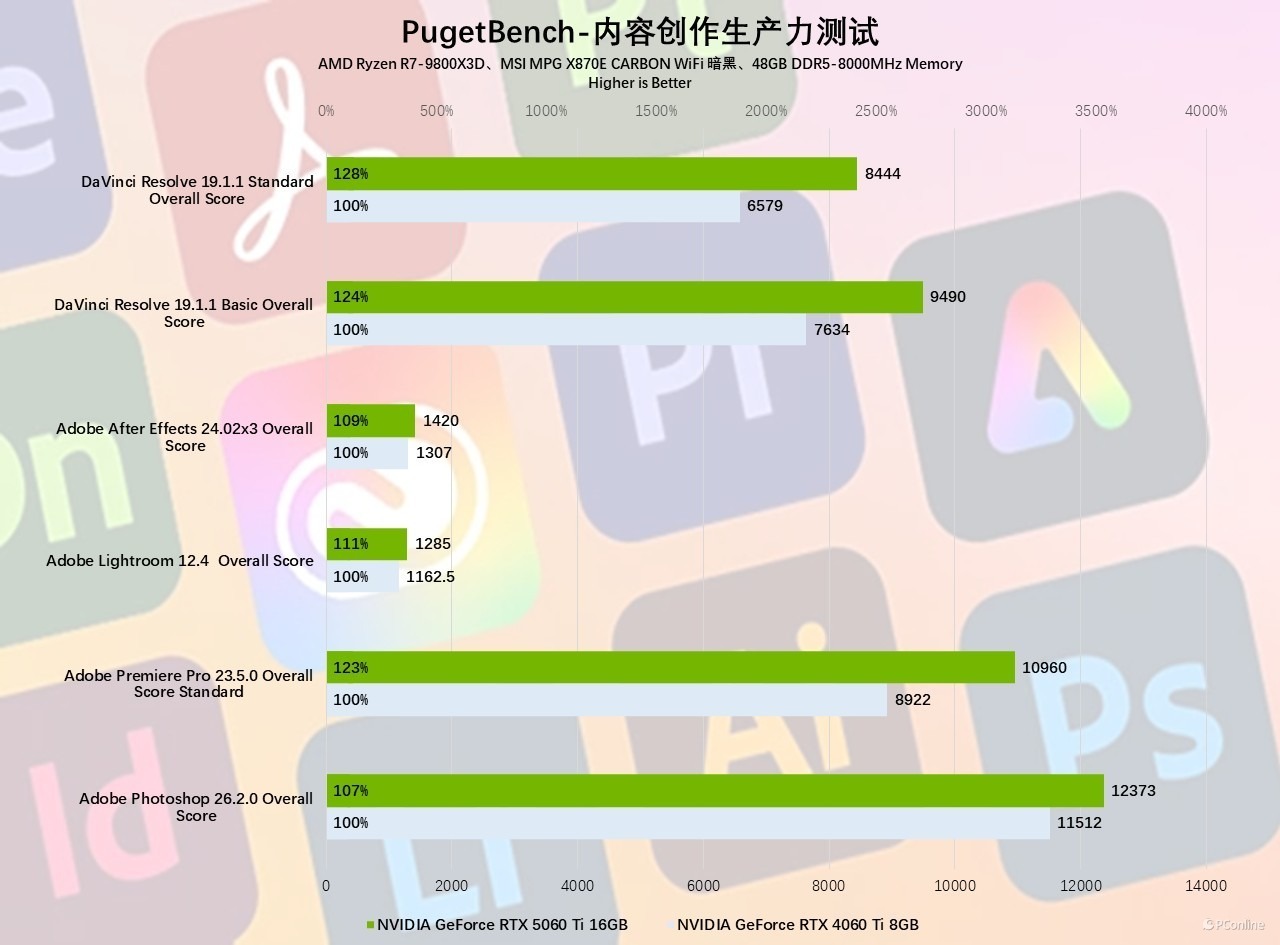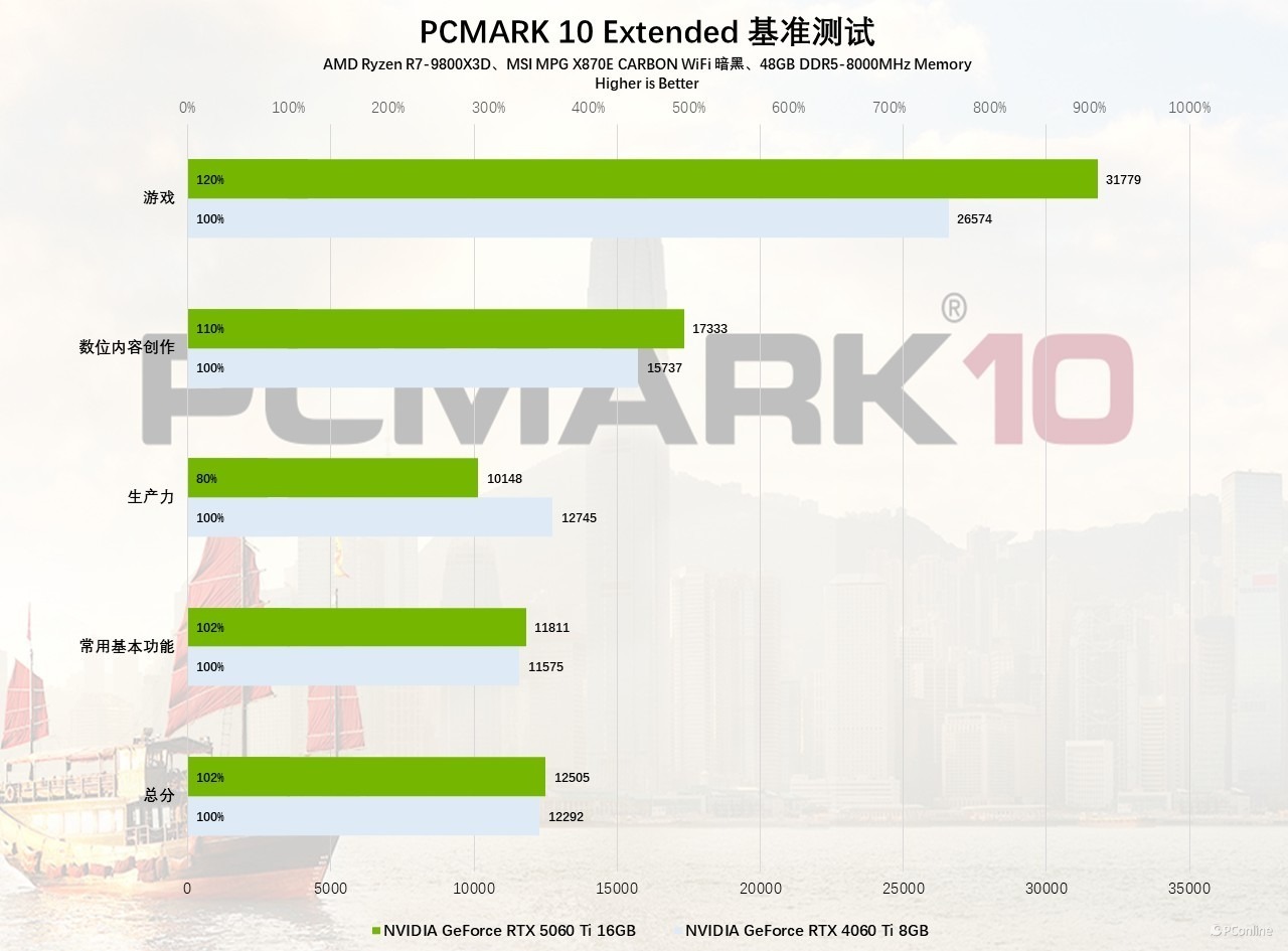 看过了游戏,下面就是专业创作领域的内容了。先给大家伙看一下综合场景的性能表现,在PCMark10 Extended测试,微星GeForce RTX 5060 Ti INSPIRE 2X 硬派师16GB在游戏、数位内容创作方面的表现更佳,基本上要比RTX 4060 Ti高10-20%左右,而生产力方面的成绩则比较低,推测是目前驱动还不完善所致。
