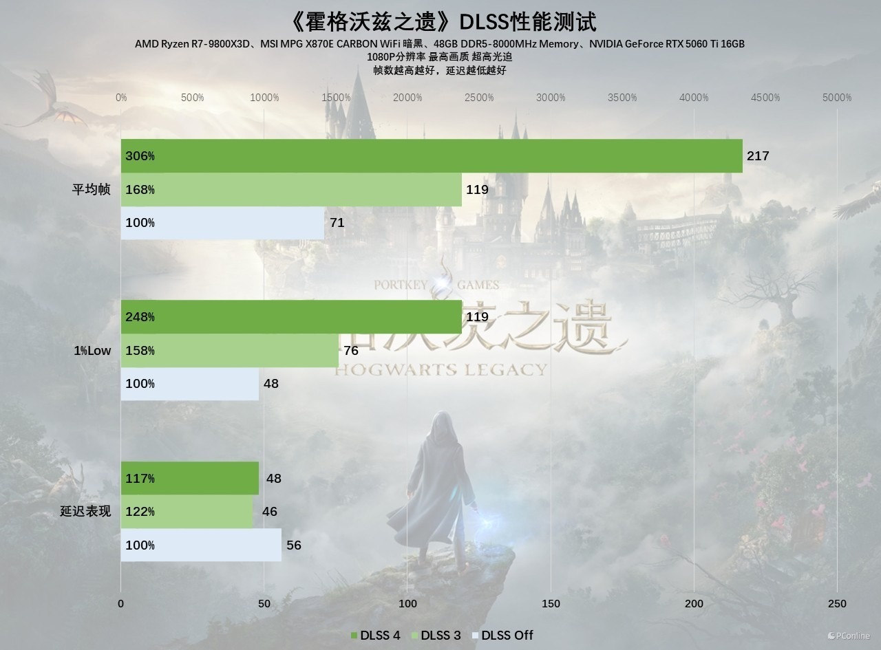 实际测试过程中,我们发现《霍格沃兹之遗》这款游戏优化还是不错的,1080P分辨率画质光追均设置最高的情况下,微星GeForce RTX 5060 Ti INSPIRE 2X 硬派师16GB在不开任何超分的情况下,平均帧为71 FPS。如果开启DLSS 3质量档,此时帧数已经能够做到119 FPS了,属于是高刷与画质的完美组合,体验相当丝滑。开启DLSS 4以后,帧数可以进一步提升至217 FPS,对比原生1080P的表现,性能提升了约3倍以上。同时实际游戏过程中,无论是1%Low还是延迟都不错,特别是延迟,相比原生分辨率还要低不少,跟手感更好。
